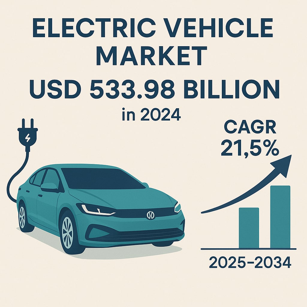 According to recent estimates the Global Electric Vehicle Market holds a value of USD 533.98 billion in 2024 with a projected compound annual growth rate (CAGR) of 21.5% between 2025 and 2034. EV battery price reductions combined with increasing environmental awareness government support and battery technology advancements propel the market.