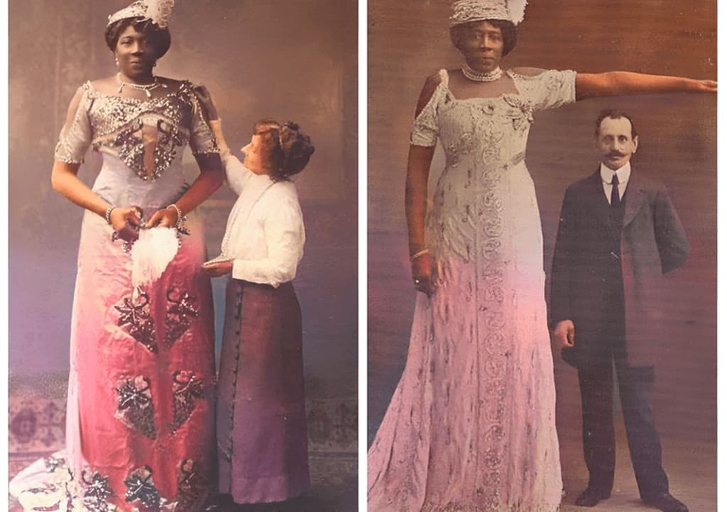 Standing at an astonishing 6 feet 10 inches (over 2 meters) tall, Mme Abomah’s commanding presence made her an instant sensation in circuses, exhibitions, and sideshows. In an era where average women stood at around 5 feet 4 inches, her height was nothing short of extraordinary.