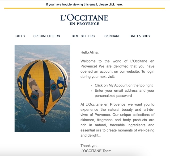 A vivid example of email automation is when a new person subscribes to a newsletter, a Welcome email will be sent to them automatically, such as in the example below. A potential buyer subscribes to the cosmetics brand L’Occitane En Provence and receives a Welcome email.