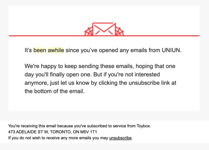 Such emails are sent to your inactive chunk of subscribers. The goal is to re-engage and hopefully convert your inactive subscribers. Your email could offer a discount, introduce a new product or simply tell your subscriber that you miss them.