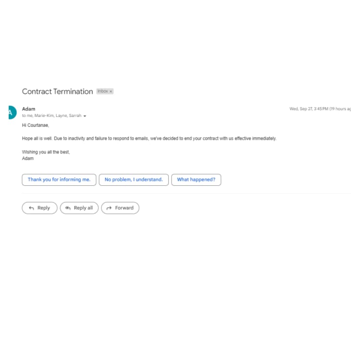 Initially, I was informed that there was no deadline for the draft, which provided me with a sense of relieve. I felt I had time to produce a high-quality piece of work. However, to my surprise and disappointment, I received an email stating that my contract was terminated due to my failure to submit the draft. I was bewildered since I had not been given a deadline.
