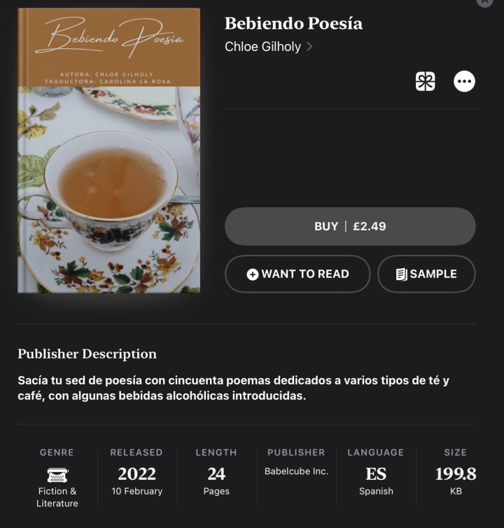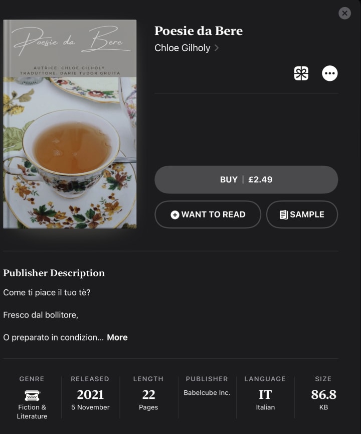 Translation projects can take several months to produce depending on the book’s work count. In my experience, I have found that shorter books have a better chance of getting your books fully translated. My first book, Drinking Poetry has been translated into Spanish and Italian on Babelcube. Tektime have an Italian translation if this book too. I don’t speak or understand Italian but I noticed both translations are different.