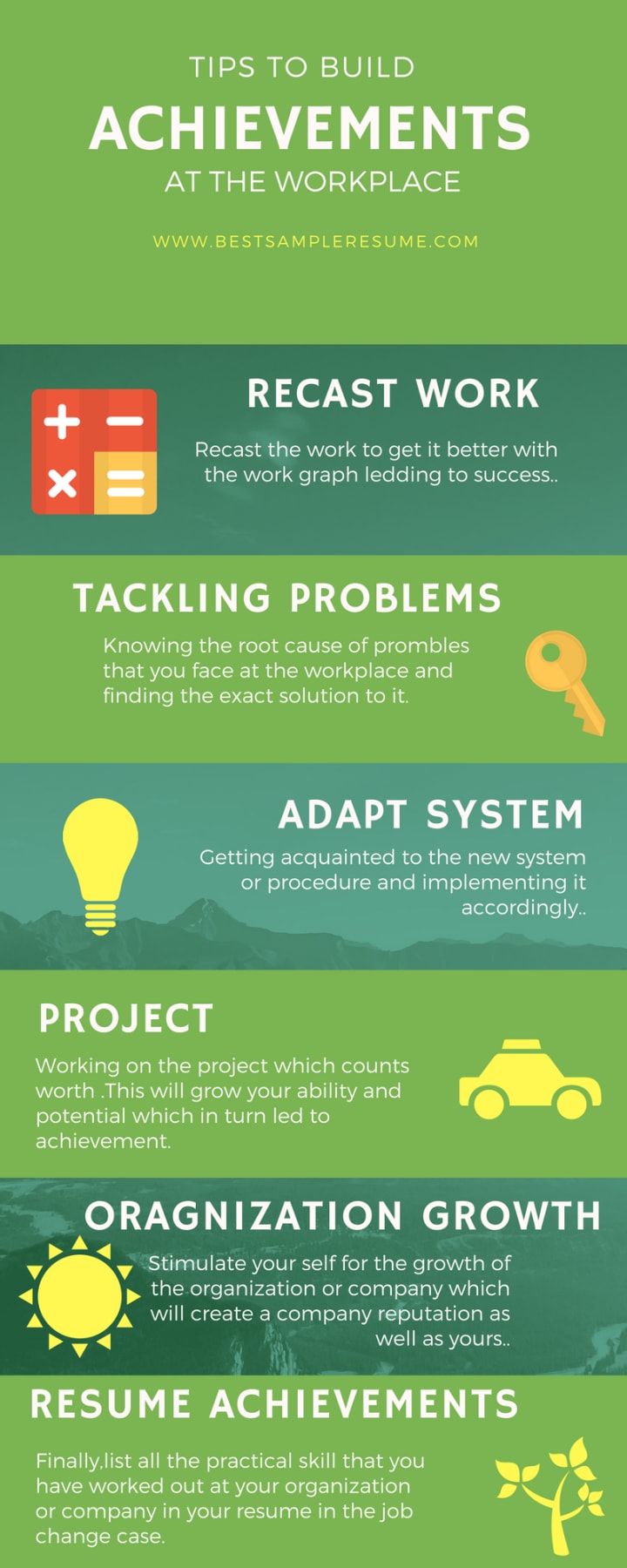 You might have worked in a variety and ample number of projects, but it is necessary to mention appropriately to catch the recruiter's attention. Instead of going for full stories, make use of bullets so that accomplishments are easily legible. These accomplishments can be in terms of increasing company's revenue by a big margin, training new recruits, enhancing productivity by actively participating in different team projects, inducing new work methods to increase output and efficiency thus saving time and money for the organization. If you received rewards or a special award from the previous employer, include it in your resume.