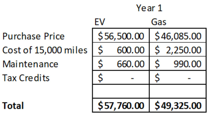 After one year the EV is going to cost about $935 more, assuming you get to enjoy the entire tax credit. That means that the following year you are saving roughly $1,980 on fuel cost and maintenance, bringing the total you’ve saved vs a gas vehicle to $1,045.