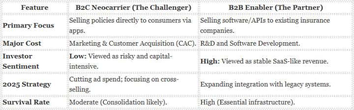 Smart startups are pivoting from expensive B2C customer acquisition models to B2B "Enabler" strategies, helping legacy insurers digitize rather than competing against them.
