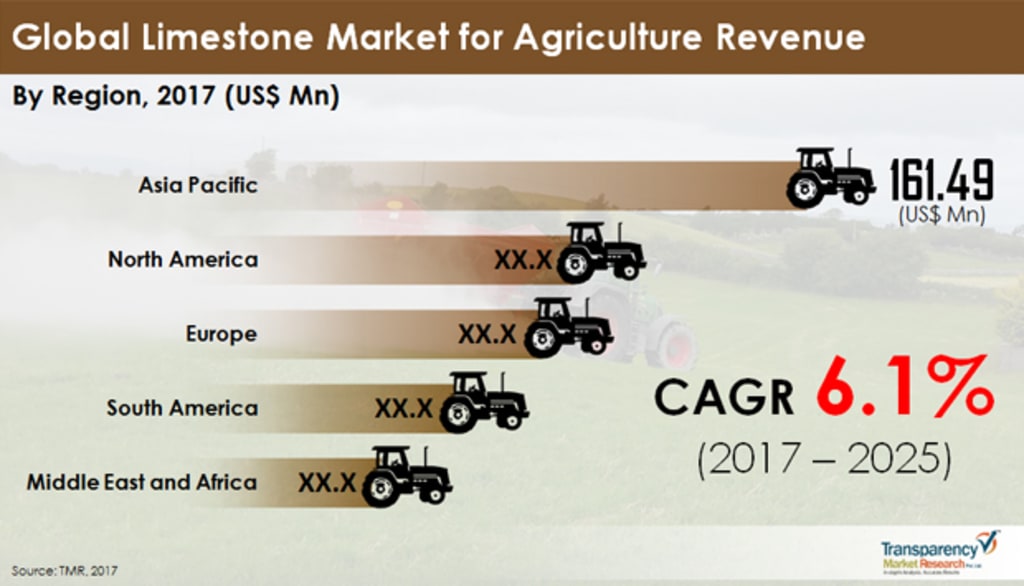 From a geographical standpoint, the Asia Pacific market for limestone for the agriculture industry presently dominates the global market in terms of growth pace and revenue owing to the large arable lands and the increased demand for agricultural produce in the region to sustain the mounting population. The region is also expected to register the maximum CAGR over the forecast period and rise to a valuation of US$294.13 mn by 2025.