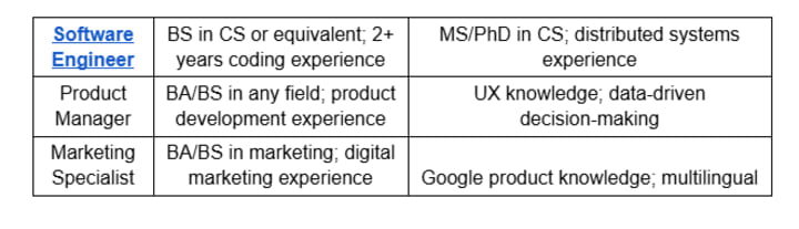 Google offers diverse roles, each with specific Google job requirements. Below are the qualifications for key positions.
