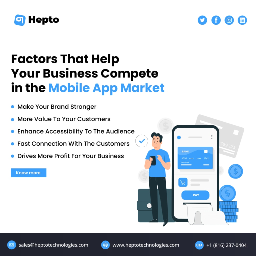 Are you looking for a way to increase your competitive advantage in the market? Hepto Technologies, one of the leading custom mobile app development companies in the USA, can help. Our experienced team of developers will work with you to design and deploy a mobile app that meets the unique needs of your business. We specialize in cutting-edge technologies across diverse platforms, delivering high-quality apps that help you boost your brand and make your services more accessible to users. Contact us today to learn more about ho