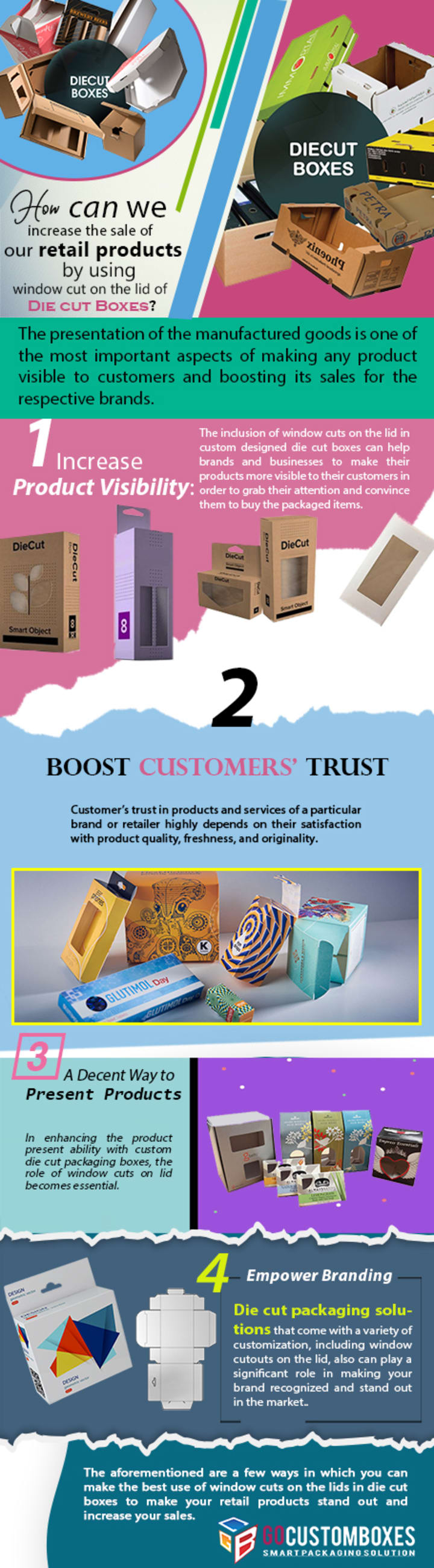 The presentation of the manufactured goods is one of the most important aspects of making any product visible to customers and boosting its sales for the respective brands. The usage of die cut boxes is found exceptional in this regard. They come in a number of designs and styles along with window cutouts in different shapes. They also contain a variety of customization choices, including perforation, gloss and matte lamination, printing in PMS, and CMYK color combinations, along with other printing and branding features that make them special for product presentation and attracting a large number of customers towards the packaged retail items. Their catchy and enticing graphics and imageries of packaged items make them alluring for customers and make it easy for the brands and retailers to attract a maximum number of customers and to make their product stand out. Almost all kinds of brands and businesses are making their use and are enjoying higher sales and profitability. Easy visibility of packaged products is one of the key things that entice customers and convince them to come across the packaged item. The inclusion of window cutouts in the lids of custom die cut boxes are found as a remarkable way to present any product at retail stores strikingly. Here are some important aspects that encourage brands and die cut boxes manufacturers to incorporate window cut in these packages that help them increase the sale of their retail products.