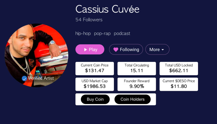 One artist I recently met on DeSo is Cassius Cuvee. He is a musician and you can support him by buying his creator coin and streaming his music on Mousai. He wrote a song about DeSo, which you can hear on his YouTube channel.
