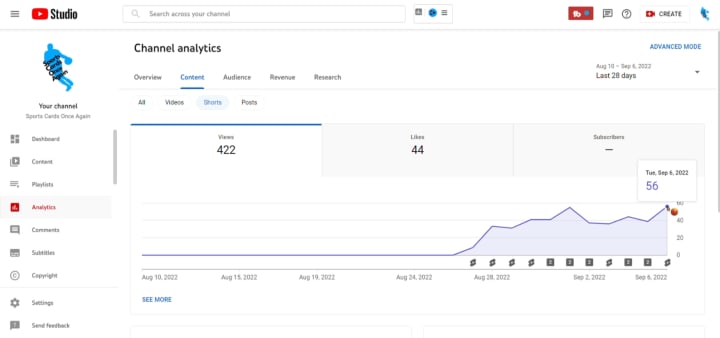 In the ‘content’ tab, you can see here that I’ve just recently started with YouTube Shorts, like I mentioned already. So far I seem to just get around 30–50 views per short, but again, we’ll see what happens to this experiment a bit later. I’m not good at the viral style of video making that a short seems to want, but it’s just another area to learn about over time.