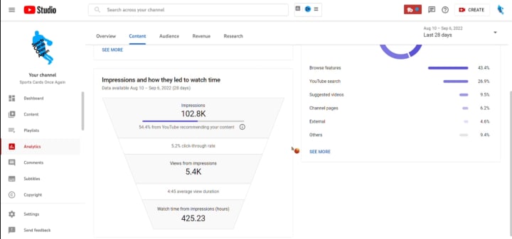 Here on my ‘video’ content tab, you can see a few more metrics. 5.2% click-through rate (which is just ‘okay’). 4 minute 45 second average watch time (which is decent).