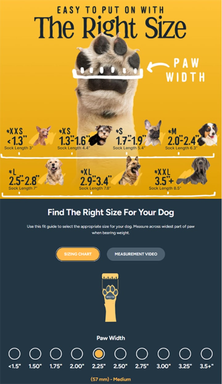 Another way DOK stands out is sizing. Unlike most brands that base sock size on a dog’s weight, DOK provides a paw-size guide with detailed measuring instructions, helping owners choose the perfect fit for comfort—and encouraging repeat purchases.