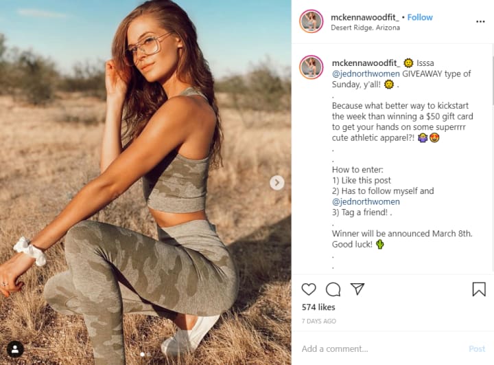 For instance, Jed North partnered with influencers like McKenna Wood to increase brand awareness among their target audience by means of a contest. This post from McKenna got over 550 likes and 250 comments.