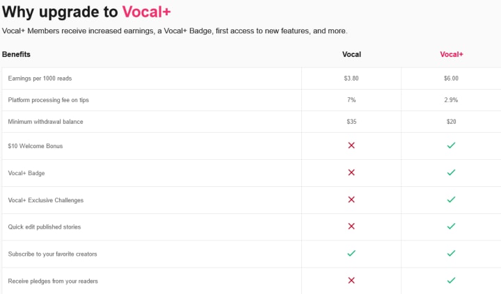 Writing and earning on vocal media is free for everyone but by spending an extra $10 you will get the following benefits: