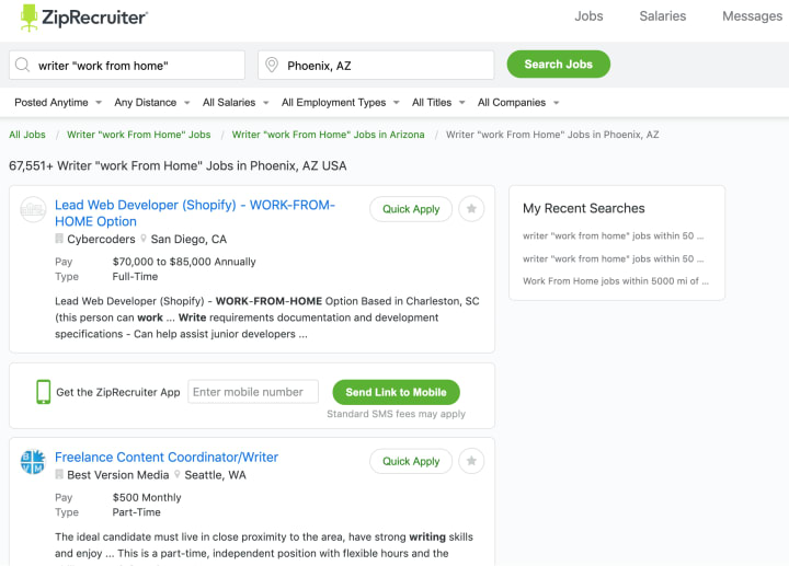 Another job site that allows you to search for work from home jobs is ZipRecruiter. Simply search for the job title you want along with remote or "work from home" in quotes. Change the location to Any Distance from you to get the most results.