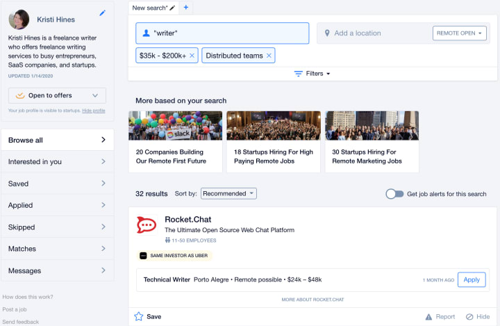 Angel.co allows you to create a profile and search for remote jobs with startups throughout the world. Be sure to use the filters to specify salary and other job requirements.