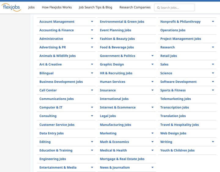FlexJobs offers work from home jobs, freelance jobs, part time jobs, full time jobs, and on-site jobs with flexible schedules. If you see a category that you have experience in that has work from home opportunities, search for them on FlexJobs.