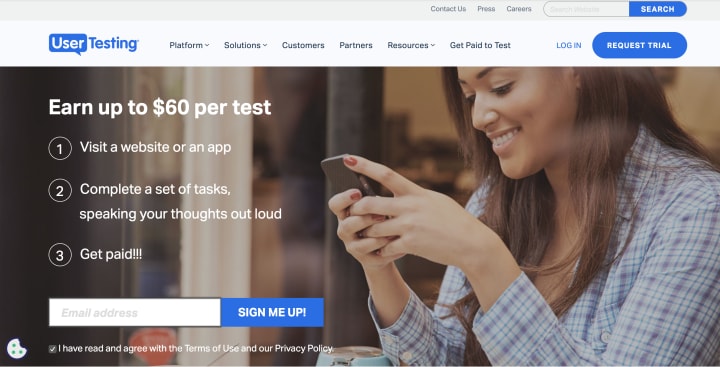 Get paid by UserTesting.com for completing a set of user testing tasks for upcoming websites and apps. You'll help create an Internet full of better user experiences by simply watching videos, answering questions, and testing out features on websites and apps to see how they work.