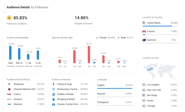 From the credibility of followers to influencer follower growth, content engagement, and interests, you can check it all out within a matter of minutes.
