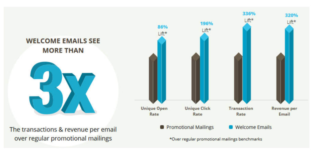 Why should you use welcome mailers? They are three times more effective in increasing revenue and transitions than regular promotional mails. This is a staggering number that you shouldn't overlook. It's worth it to include a welcome series in your marketing mix.