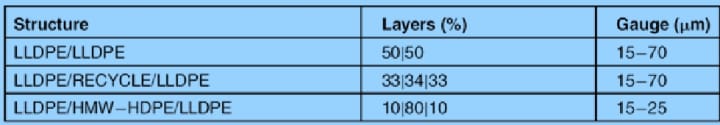 By introducing of LLDPE and using coextrusion such as 2 or 3 layers for production of trash (or refuse) bags (Table below). We can accommodate film down gauging and by using recycled material allows for improved economics and addresses environmental concerns. High molecular weight HDPE polymers are also finding increased usage due to further down-gauging opportunities. This is the largest coextruded film market segment.