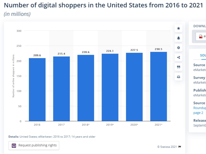 The below-mentioned graphic shows the increase in the number of online shoppers in the USA, which includes online grocery shoppers as well. The figures as per Statista are projected to reach 230.5 million in 2021, positioning the United States as one of the leading eCommerce markets based on online shopping penetration.
