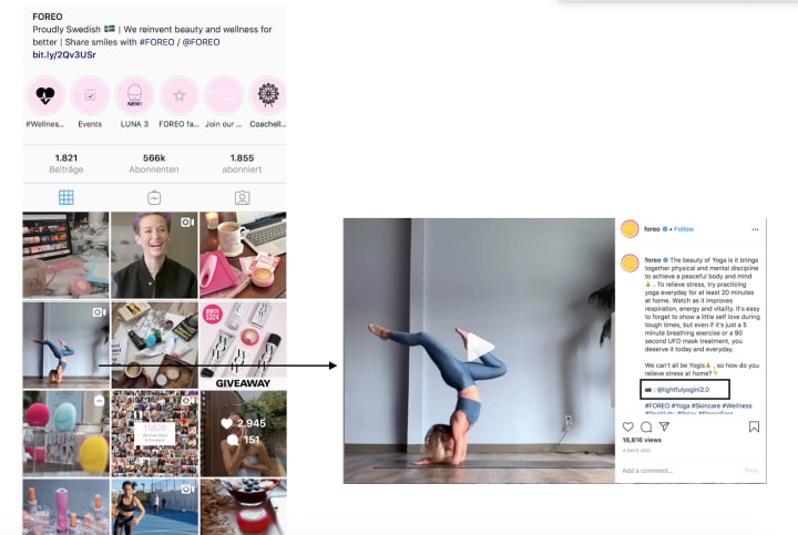 Let’s take a look at the Instagram strategy adopted by FOREO, a European beauty and wellness brand. Many posts on their Instagram feed are influencer generated. While reposting their content, Foreo also tags the influencers in their captions.