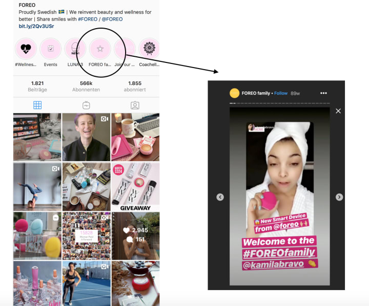 Additionally, they also feature influencers’ Instagram Stories as Stories on their own feed. To ensure that such posts don’t disappear from their profile after 24 hours, they add them as “Highlights.” All such influencer-generated content is grouped together under a Highlight titled, “FOREO family”