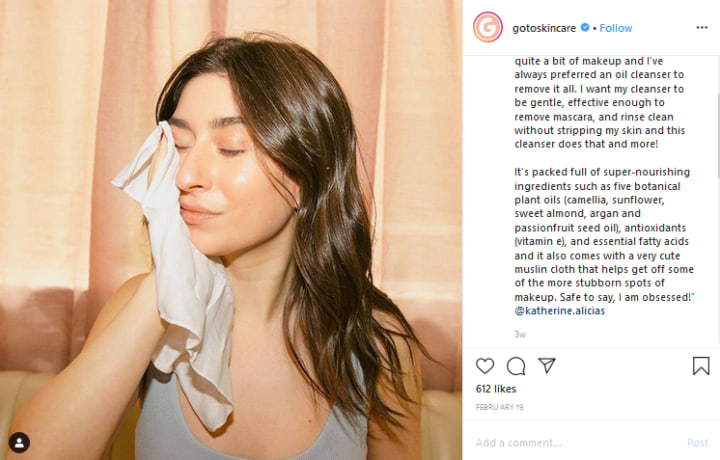 For instance, Go-To skincare often features influencer-generated content on their Instagram page. As a part of their influencer marketing campaign, Instagram influencer, Katherine Alicia, posted a review of Go-To’s Fancy Face Oil Cleanser on her profile.