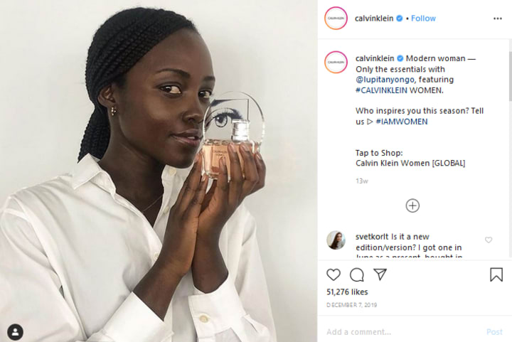 For instance, American fashion brand, Calvin Klein featured a post from influencer, Lupita Nyong'o, on their Instagram feed to promote their new ad campaign which explored femininity. In the post, the brand encouraged users to share who inspires them using the hashtag #IAMWOMAN.