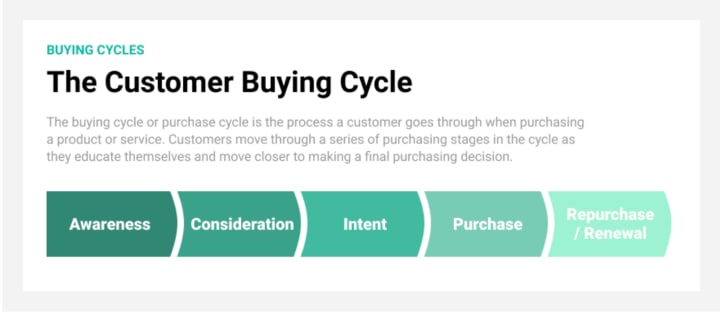 A buying cycle, sometimes referred to as the purchasing cycle, is the process a new customer goes through when they purchase a product or a service. It has 5 distinct stages - Awareness, Consideration, Intent, Purchase, and Renewal (re-purchase). There are distinct characteristics of consumers in each stage of the buying process.