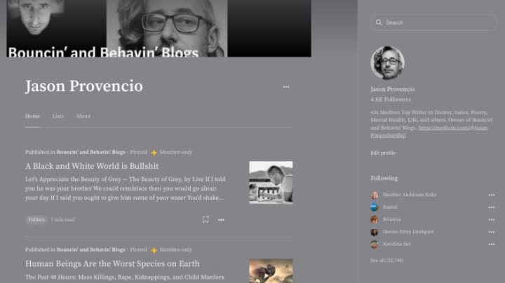 First obvious choice? My Bride. We’re best friends. She’s also a part-time writer here on Medium. She’s had a hell of a first two months writing here and doing pretty well on earnings, for being so new. She knows that reads equal income. Obviously, it’s her right?