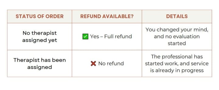 ✔️ Act early if you’re unsure. Once a therapist is assigned, the order becomes non-refundable.