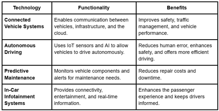 Here is a table outlining some key IoT-enabled technologies used in the automotive industry: