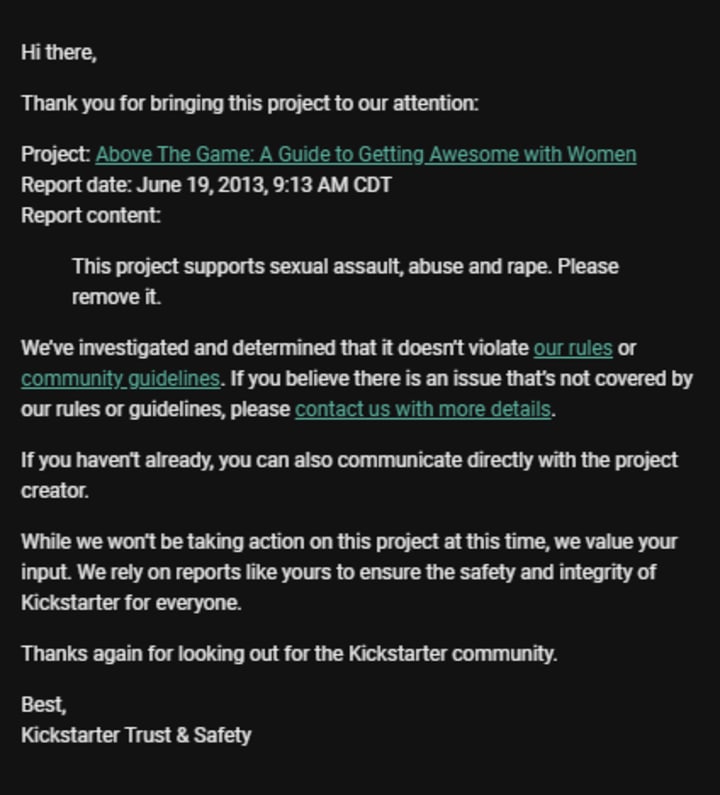 Kickstarter took seven years to respond to a complaint regarding a PUA campaign promoting rape as a tactic