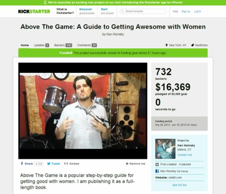 I found that curious, since I have not used Kickstarter in some time. I opened up the E-mail to find that in 2013, I filed a complaint regarding the notorious Kickstarter titled "Above The Game: A Guide to Getting Awesome with Women". The title seemed familiar. Then I saw my comments on the matter and remembered the incident with a gleaming flash.