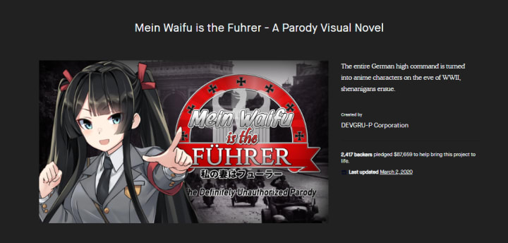 Since this time, Kickstarter has allowed other lovers of misogyny, racism and violence against marginalized people to express their wildest fantasies on their platform. "Mein Waifu is the Fuhrer," a 2019 Nazi-themed anime dating simulator, raised over $86,000 dollars and was classified as "parody" by Kickstarter and allowed to fund production.