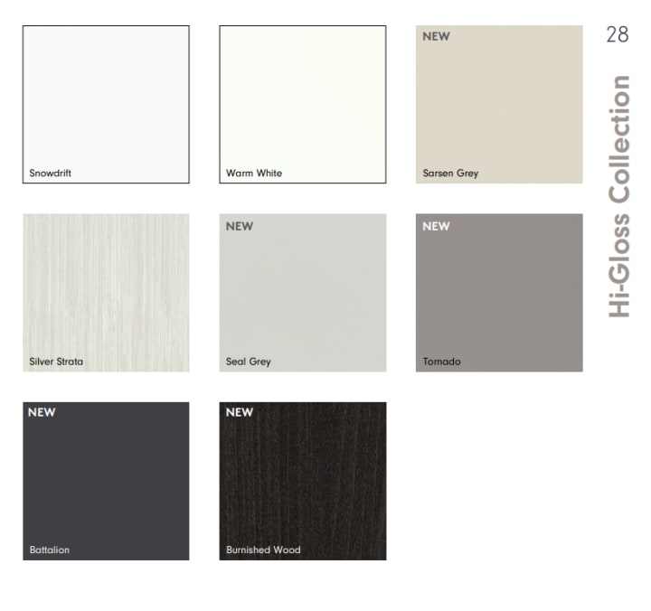 Their standard range collection comes in a different rang eof different colours compared to their Hi-Gloss collection which only comes in greyscale colours. You can use it for kitchen cabinetry, cupboards, drawers, and shelving since it's durable and easy to clean/ If you're more after colours that aren't greyscale, then you might want to consider their standard range collection. If you're still unsure, you're more than welcome to come check out our someone to get a feel of the materials and see the colours available.