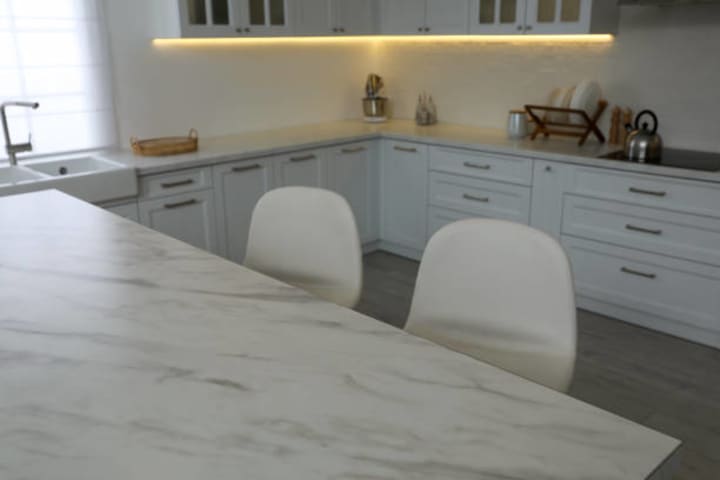 Marble is porous a relatively soft natural stone material that is still often used for benchtops due to its beautiful and unique patterns. Although it is softer than granite, it still offers a luxurious and elegant look in a kitchen.