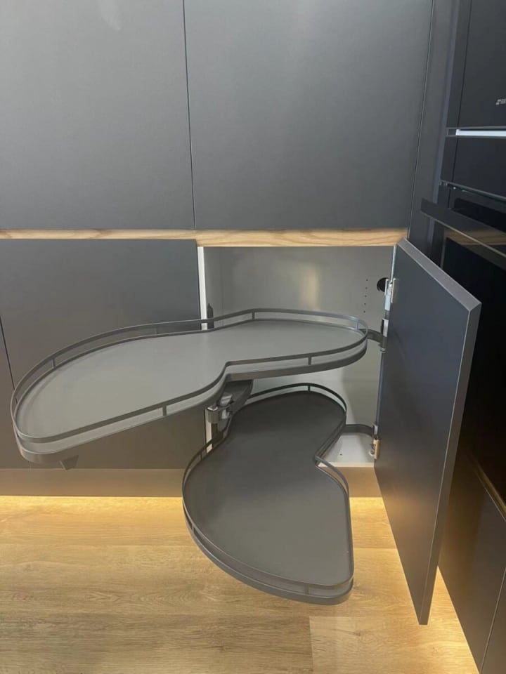 A Lazy Susan can turn full circles. You can find this type of lazy Susan on dining tables and cabinet shelves made with them can be very convenient to use, offering you as much space to store things. This style of organising usually features three shelves but can be customised to have two to five shelves as per the need of the user. The full circle shape offers maximum movement and allows for unlimited access to each of the items.