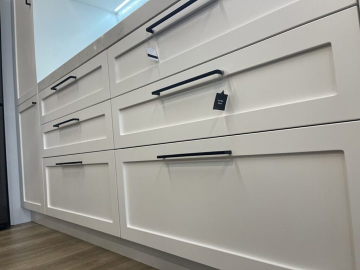 Melamine at Bestwood comes with a 10 year warranty and they're also super easy to lean as they're low maintenance. To clean this material, simply use a damp cloth and any spills or fingerpirnts will come off with warm water and detergent, or a wipe cleaner. Important thing to note is to not use abrasive cleaner or cleanning tools on this kitchen cabinet material.