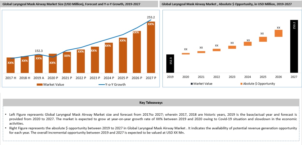 The global laryngeal mask airway market was valued at USD 152.3 Million in 2019 and is projected to reach USD 253.2 Million by 2027 expanding at a CAGR of 6.6 % during the forecast period, 2020-2027. Laryngeal mask airway (LMA) is a supraglottic airway device developed by Dr Archi Brain in 1981, which received FDA approval in 1991. These masks are used for keeping the patient’s airway open when unconscious and under anesthesia. They are made from materials such as PVC, silicone, polycarbonate, polypropylene, and paper. PVC and silicone are primarily used for making these masks. Types of LMAs include, reusable and disposable (single-use). Single-use masks are widely used by people; therefore, the segment is expected to hold a major share of the market. These masks are good alternatives of face masks and endotracheal tubes, and are available in different sizes.