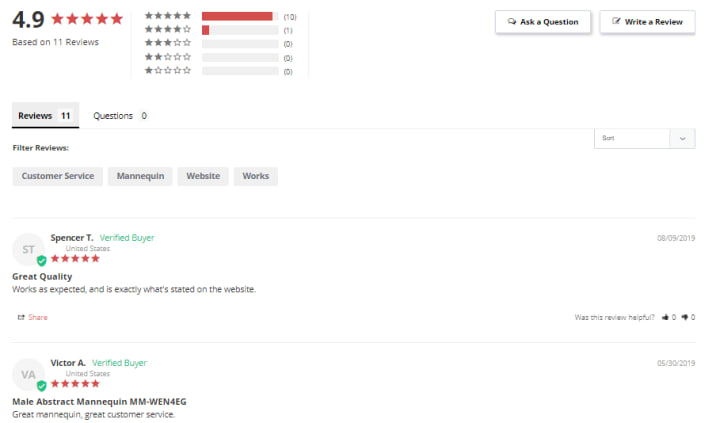 An excellent example of this is how Mannequin Mall displays the reviews of a product below the product image and description: