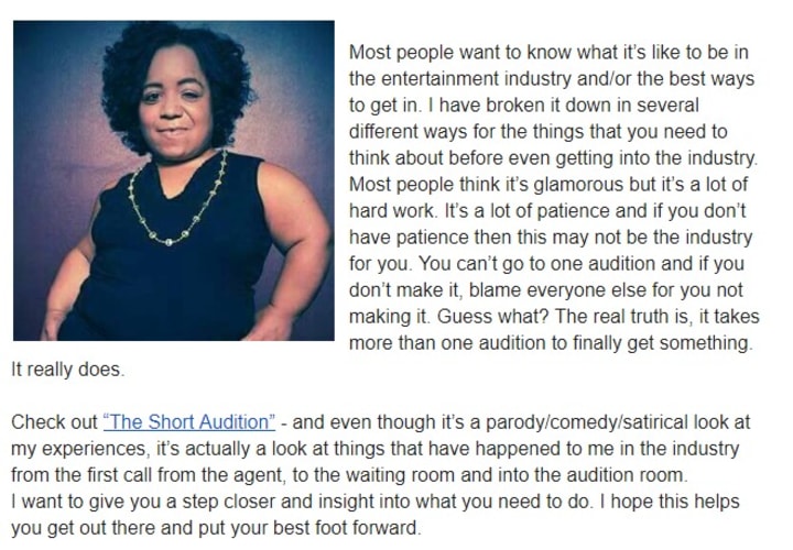 I just got a spark for wanting to act. I performed as many plays as I could in school and if I didn’t get to perform in them I had the opportunity to direct a couple. That was always fun. When I went to college I took International Business, Business Management and Drama. I wanted to somehow be involved with film. I saw only a few films with little people in them “Wizard of Oz”, “Willy Wonka and the Chocolate Factory”, “Willow”, “The Bride” starring David Rappaport and I saw an Episode of “Little House on the Prairie” with actor Billy Barty (who was a little person). What I noticed for myself was that there weren’t very many little women in the industry that I could look up to. Sure there would be one here and one there, but as quick as they came they disappeared and they’d begin to use the same little male person over and over.