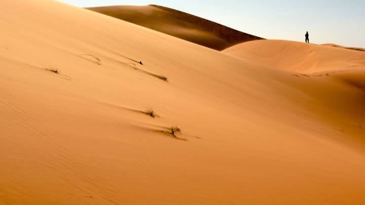 Engulfed in the desert's parched silence, he was nothing but another grain of sand in the wind. But in that moment, he felt more alive than ever before.