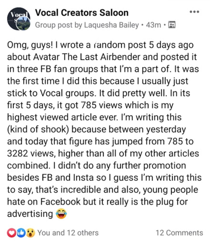 Without a network, you are like the tree that fell in the Amazon when no one was around. It may or may not make a sound, but we will never know because we were not there. Therefore, as a writer you should always strive to find like-minded individuals to collaborate with. Join the many facebook groups available to writers but also the ones specific to the platform(s) that you write for. Here are some Vocal Writers' top choices for facebook groups: Vocal Creators Saloon, Vocal Creators Hub, and The Vocal Creators Lounge.
