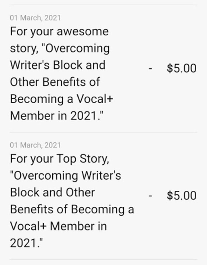 The good news is that your wallet does not increase by reads alone! As I mentioned before you can get a bonus for reading and liking other creators' work! And don't try to take a shortcut and like articles without reading, the vocal algorithm will know! My consistent highlight for you is making an effort: read for fun, write for fun and collaborate. As you grow, learn and practice you'll eventually be ready to make an extra effort to get your work chosen as a top story, or simple as an awesome, informative read like my recent article Overcoming Writer's Block and Other Benefits of Becoming a Vocal+ Member in 2021.