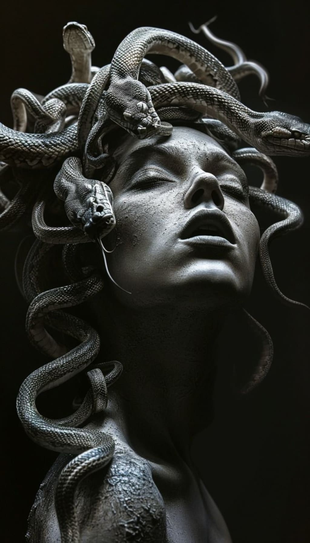 The line "snakes for hair and a gaze that turned men to stone" is mentioned. It is mythology, a fable that has been exalted. Additionally, everything in a myth or fable serves as a symbol for something else. I'm referring to a human woman with snake-like hair and a look that could make men go cold. That is truly blatantly symbolic. However, what might "hair of snakes" and "gaze that ruined men to stone" mean? The story of Medusa represents nothing more than the earliest days of the culture of purity. As you can see, Poseidon was not held accountable in the myth for the horrible act of raping a goddess devotee. Why? Because a man told the story.
