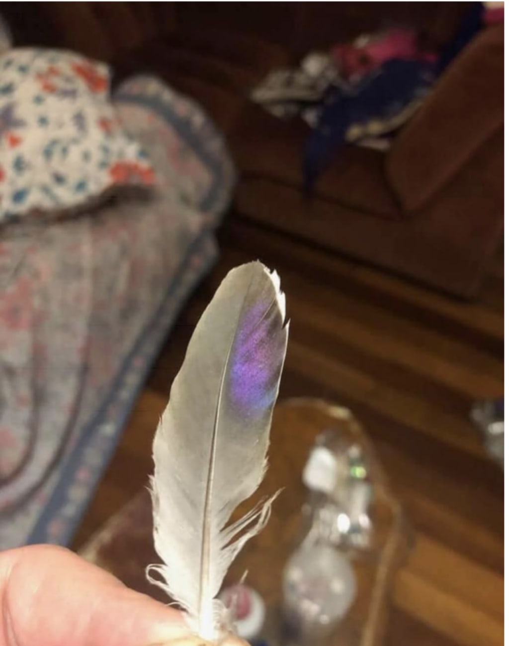 (See file photo): I just found this feather on my kitchen floor. It is not from Charlie. I love the purple iridescent top right quarter. A gift from one of the wood pigeons or a sign from the angels? Cute, huh?!